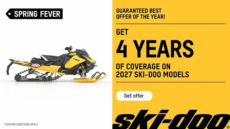 †† Guaranteed best promotional offer of the year: BRP guarantees that no other BRP manufacturer offer will be greater than the advertised 2026 Spring Sales Event prior to January 1, 2027. The comparison will be based on the coverage offer available for identical Ski-Doo snowmobiles and does not take into account rebate(s) or other promotional benefits which may be offered by BRP dealers. Mid-size, youth and EV models are excluded from the guaranteed best promotional offer of the year. Offer may not be combined with other offers. While quantities last.